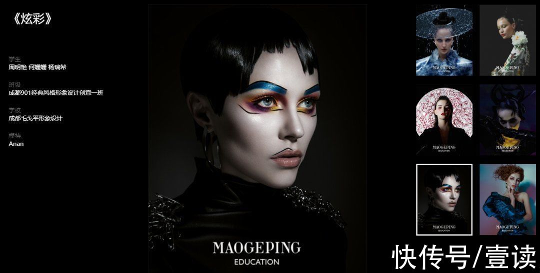 几乎所有的彩妆广告都遵循这一底层的传播逻辑。比如,彩妆大师毛戈平最出圈的是“素人化妆”,但其创办的化妆学校官网主页上,学员作品展示多是更有表现力的“彩绘”: